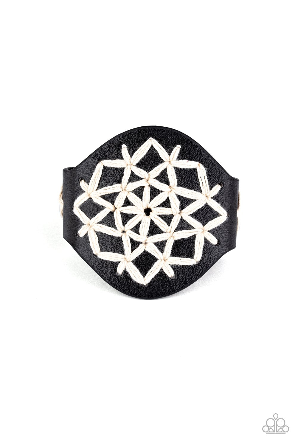 Twine-like cording is stitched across the front of a rustic black leather bracelet, creating an artisan inspired centerpiece around the wrist. Features an adjustable snap closure.