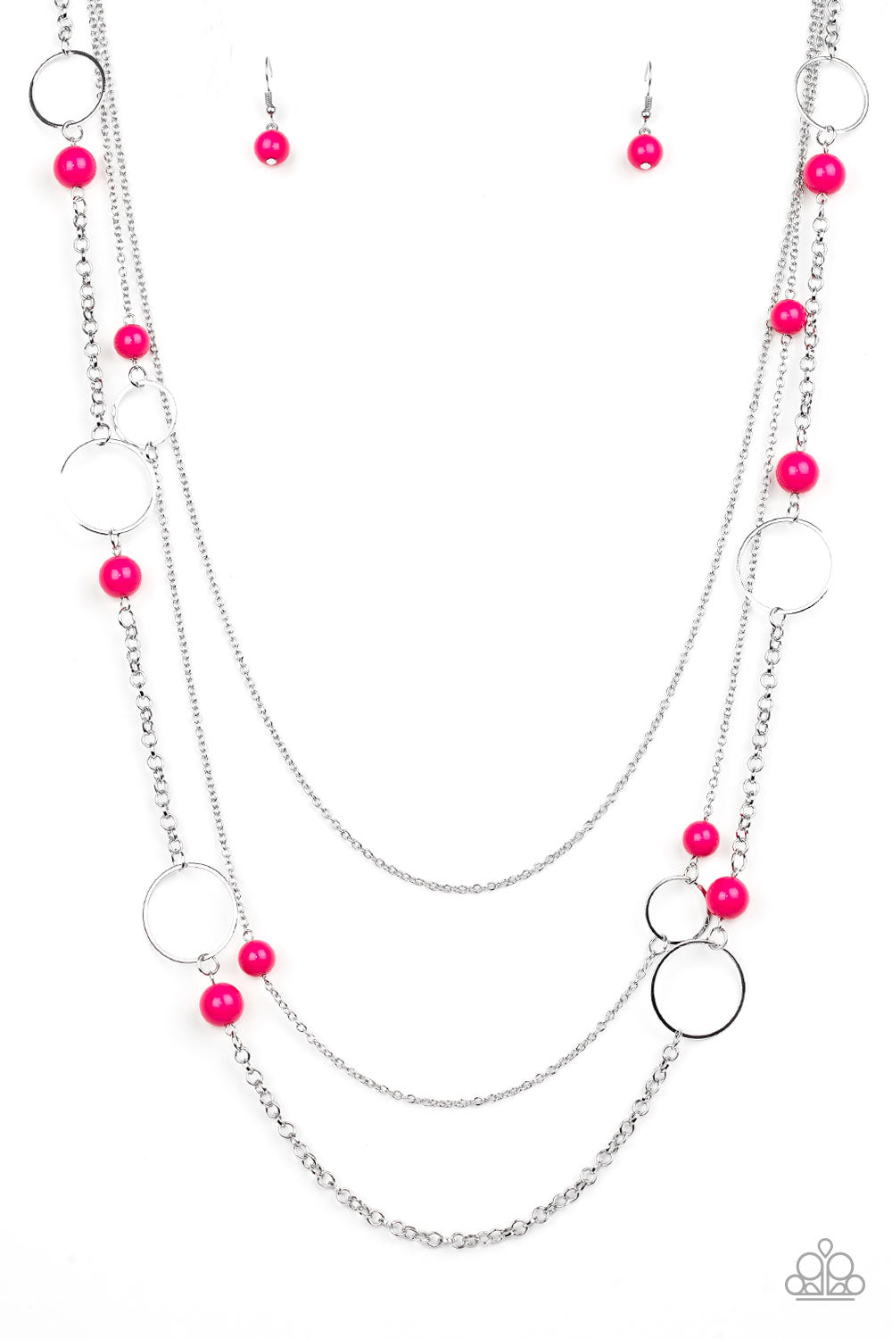Featuring vivacious pink beads and shimmery silver hoops, mismatched silver chains layer down the chest for a seasonal look. Features an adjustable clasp closure.