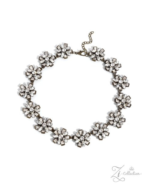 Embellished atop brass framed petals, a collection of dainty white emerald-cut gems blooms beside marquise-cut white petals along round white gem centerpieces for a radiantly rustic display of flowers. Pronged brass fittings adorn each marquise-cut gem, creating further hints of metallic sheen while emphasizing the design’s handcrafted character and vintage refinement. Features an adjustable clasp closure.