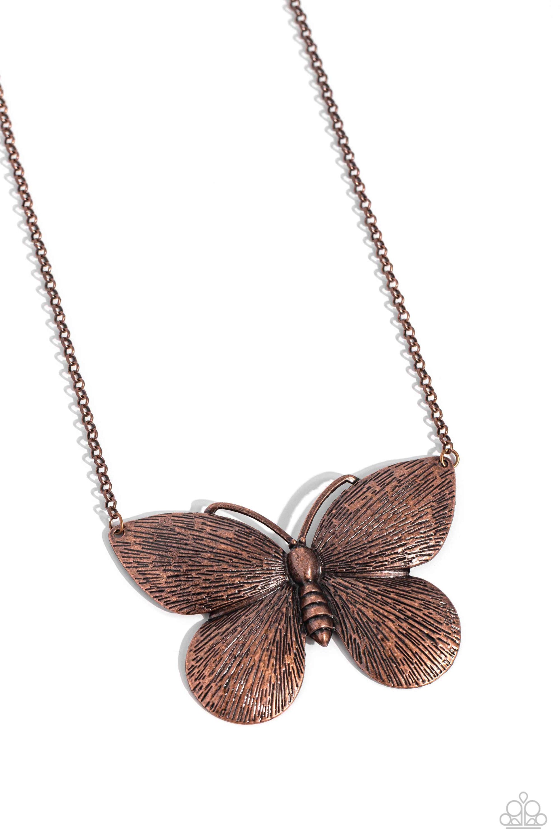 Brushed in a linear texture an exaggeratedly large copper moth plate flutters along a copper chain below the collar for an enchanting fashion. Features an adjustable clasp closure.