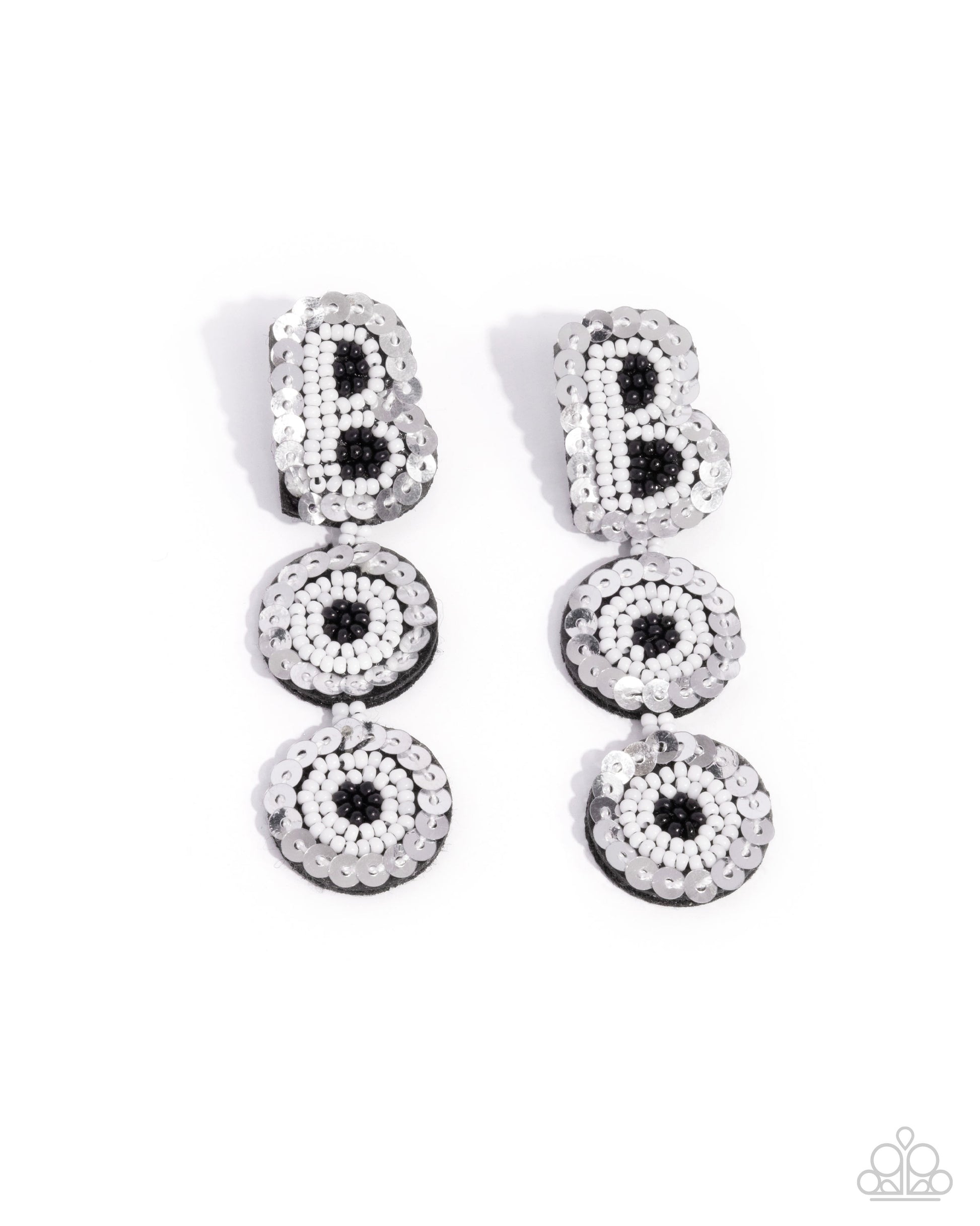 Bordered in silver sequins, a collection of white and black seed beads are embellished across a black felt background spelling out the word "BOO" for a spooky, shimmery statement. Earring attaches to a standard post fitting.