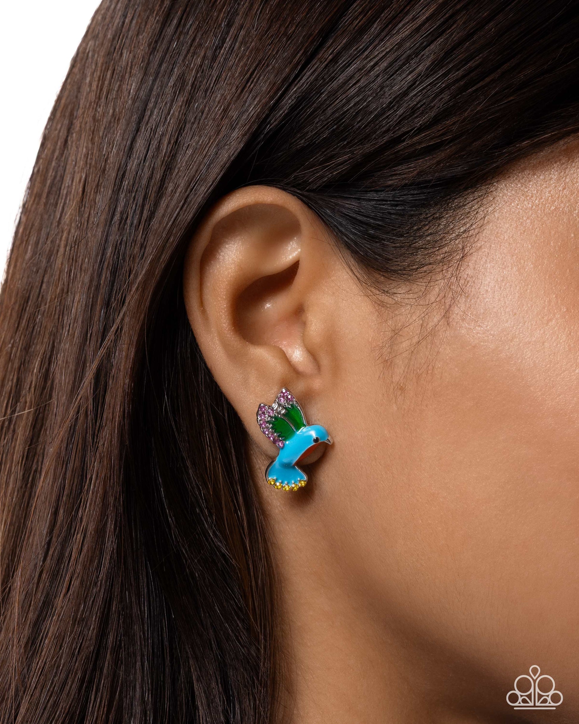Dusted in fuchsia and yellow rhinestones, a multicolored-painted hummingbird flutters atop the ear for a wildly whimsical display. Earring attaches to a standard post fitting.
