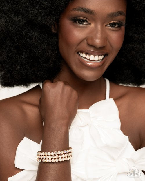 Three glistening rows of opalescent, white, and iridescent gems, pronged in place by gold fittings, curl along a coiled wire, creating a blinding infinity wrap style bracelet around the wrist. Due to its prismatic palette, color may vary.