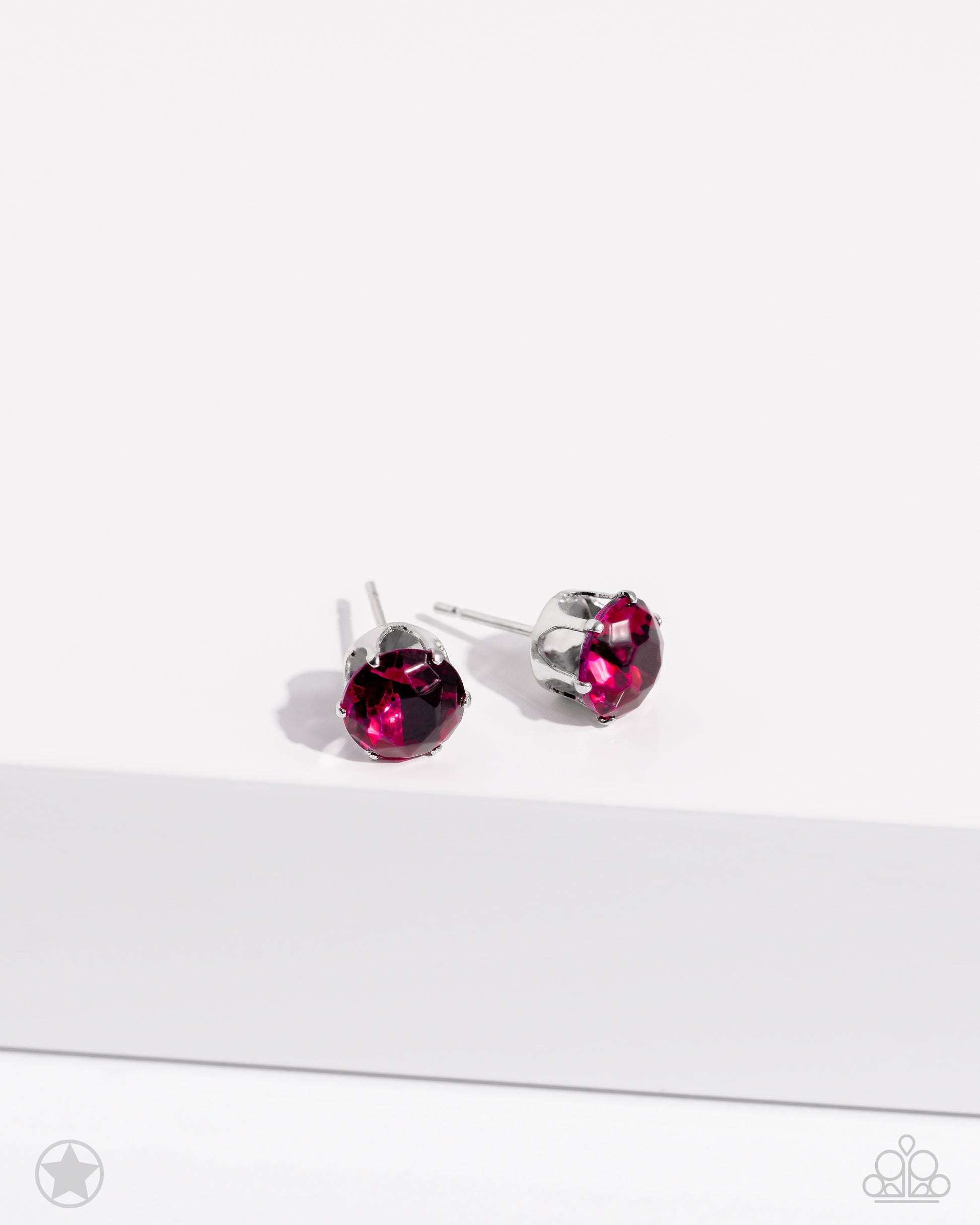 A sparkling fuchsia rhinestone is nestled inside a classic silver frame for a timeless look. Earring attaches to a standard post fitting.