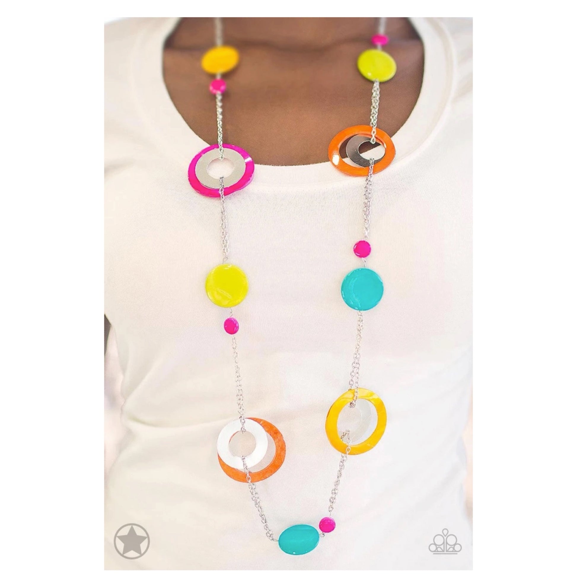 Chunky brightly-colored rings and discs with swirly marble finishes join thick metal hoops to climb a simple silver chain and create a retro-inspired feel. Features an adjustable clasp closure.