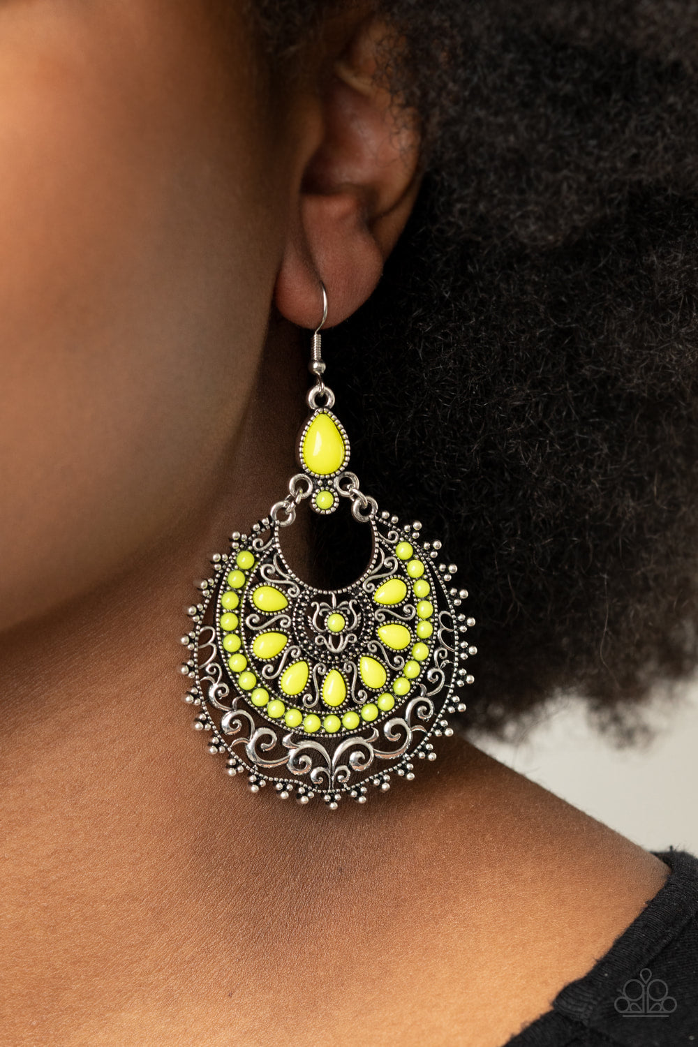 Featuring the neon shade of Green Sheen, a dainty collection of round and teardrop yellow beads embellish the front of a decoratively studded and filigree filled silver frame for a whimsical splash of color. Earring attaches to a standard fishhook fitting.