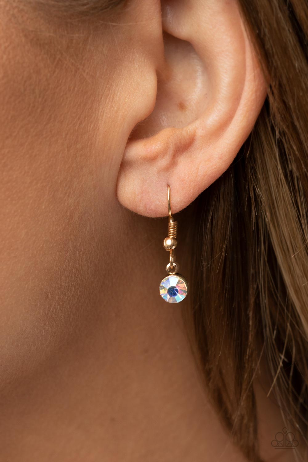 An iridescent heart-shaped gem is pressed into a simple gold frame at the end of a gold box chain creating an adorable sentiment below the collar. Features an adjustable clasp closure.