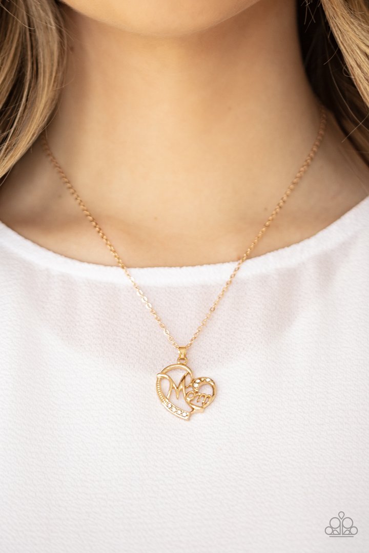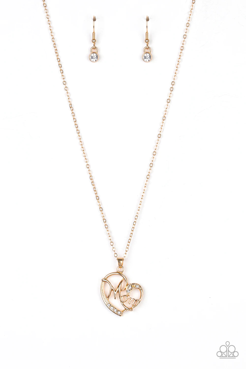 Encrusted in sections of dainty white rhinestones, a shimmery gold heart frame swirls into the word, "Mom", across the center. The charming pendant swings from the bottom of a dainty gold chain below the collar for a timeless finish. Features an adjustable clasp closure.