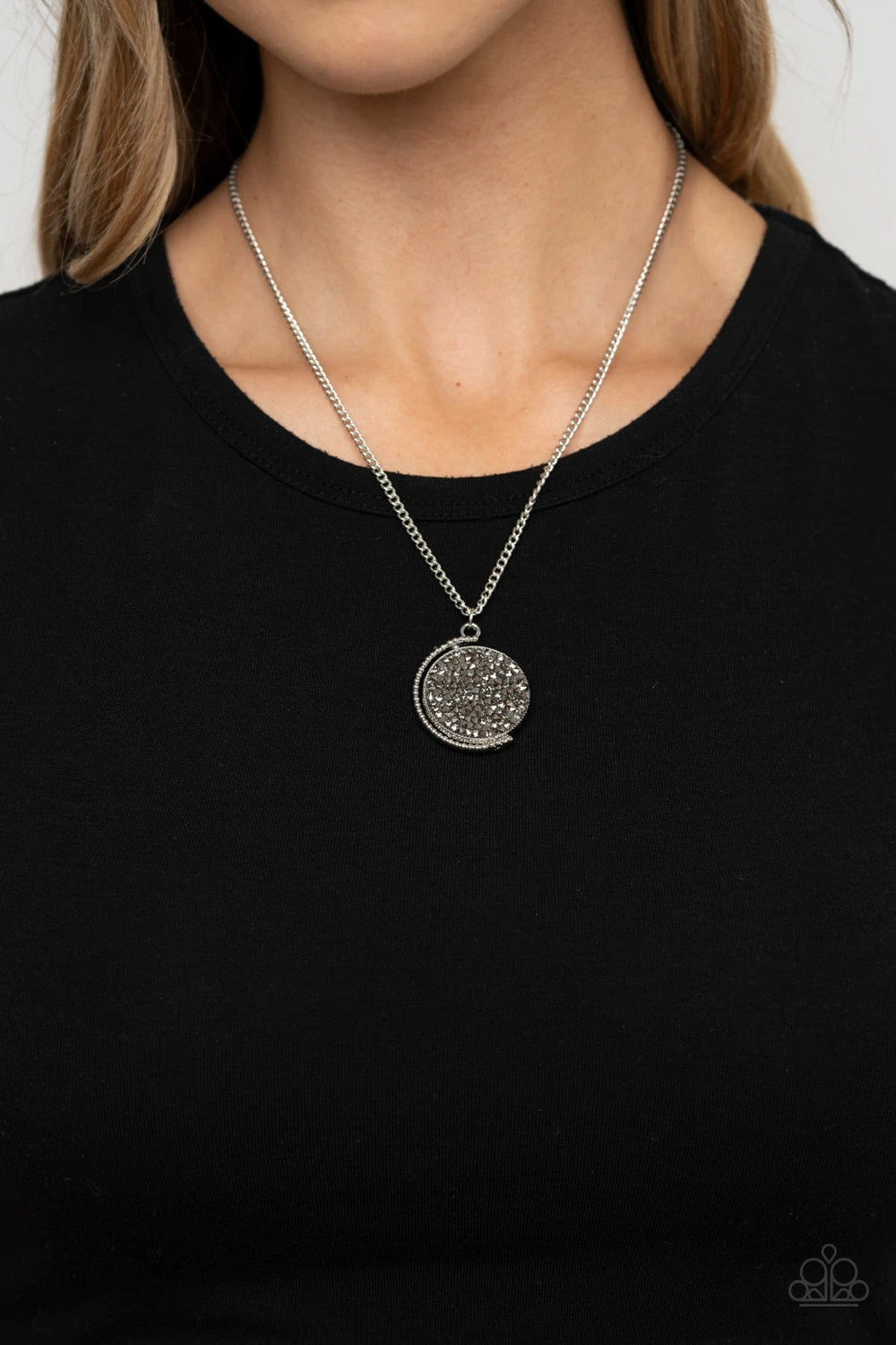 A smoldering collision of smoky and hematite rhinestones are encrusted across the front and back of a textured silver disc below the collar. Threaded along a dainty rod, the glittery pendant effortlessly spins on its axis inside a silver studded half-circle frame. Features an adjustable clasp closure.