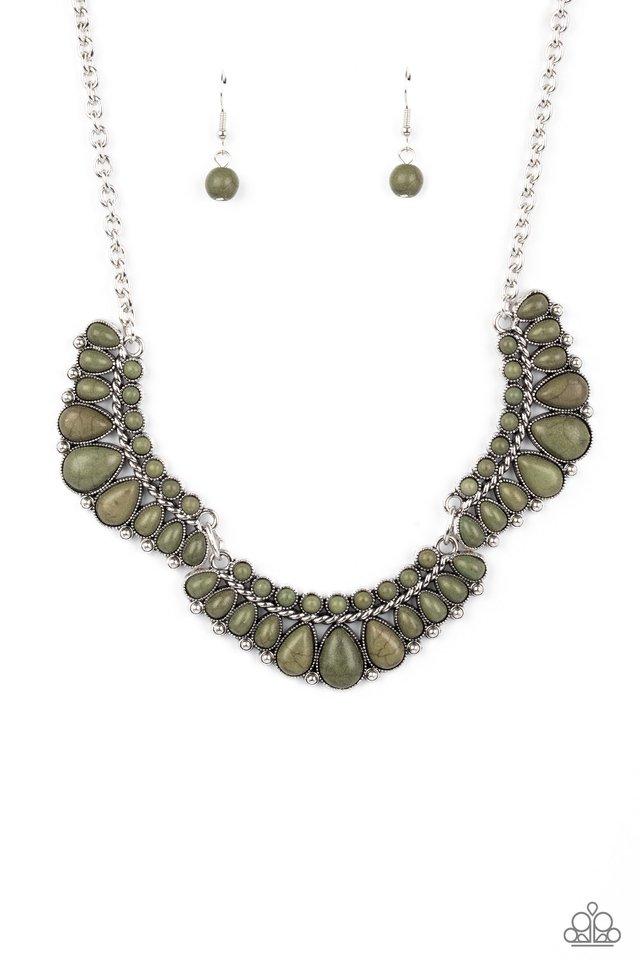 Featuring metallic ropelike textures, three curved silver frames are dotted in rows of round and teardrop green stones as they connect into an earthy scallop below the collar. Features an adjustable clasp closure.