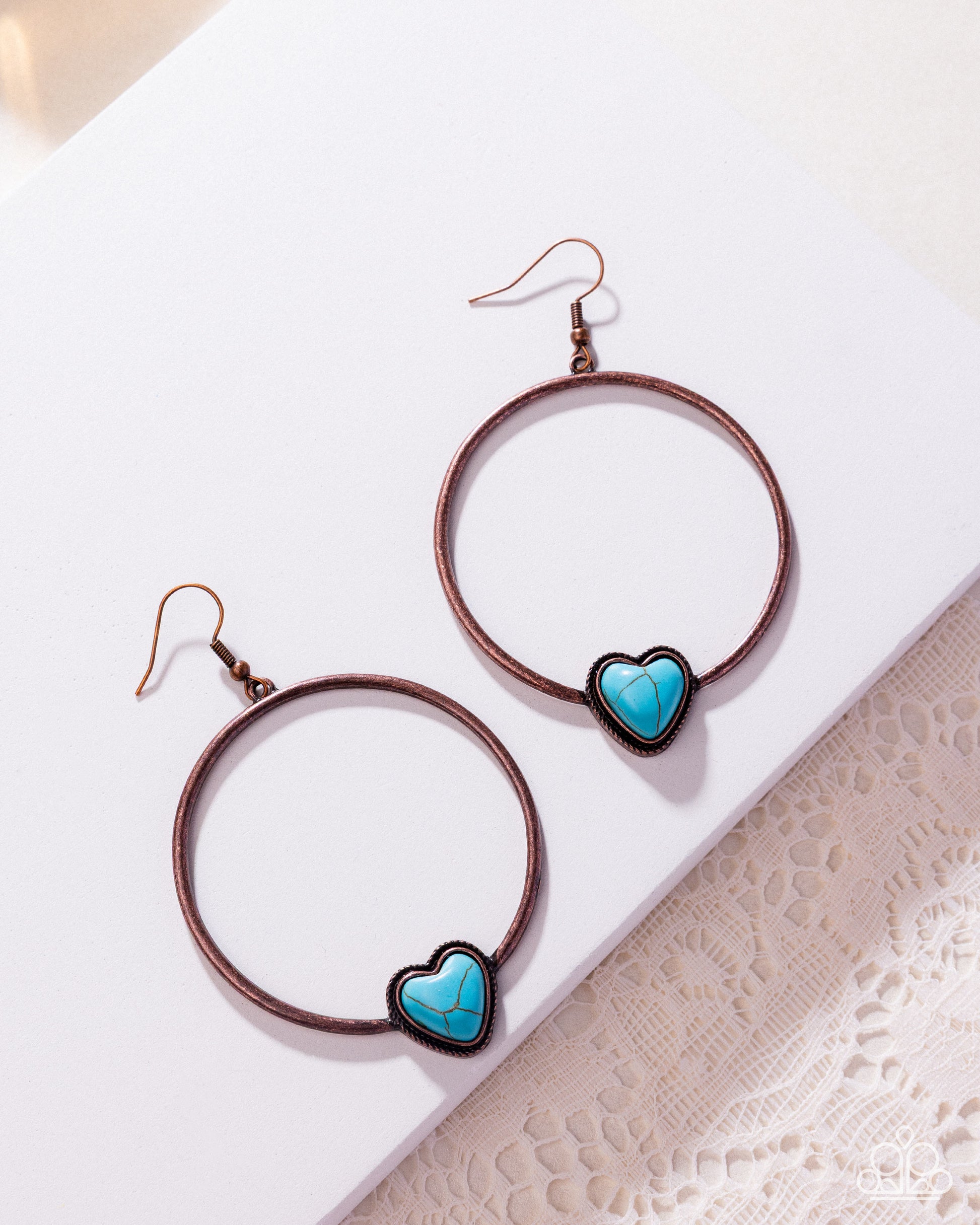 A dainty copper hoop attaches through the middle of a studded, turquoise heart stone frame, creating a flirtatious pop of color. Earring attaches to a standard fishhook fitting. As the stone elements in this piece are natural, some color variation is normal.