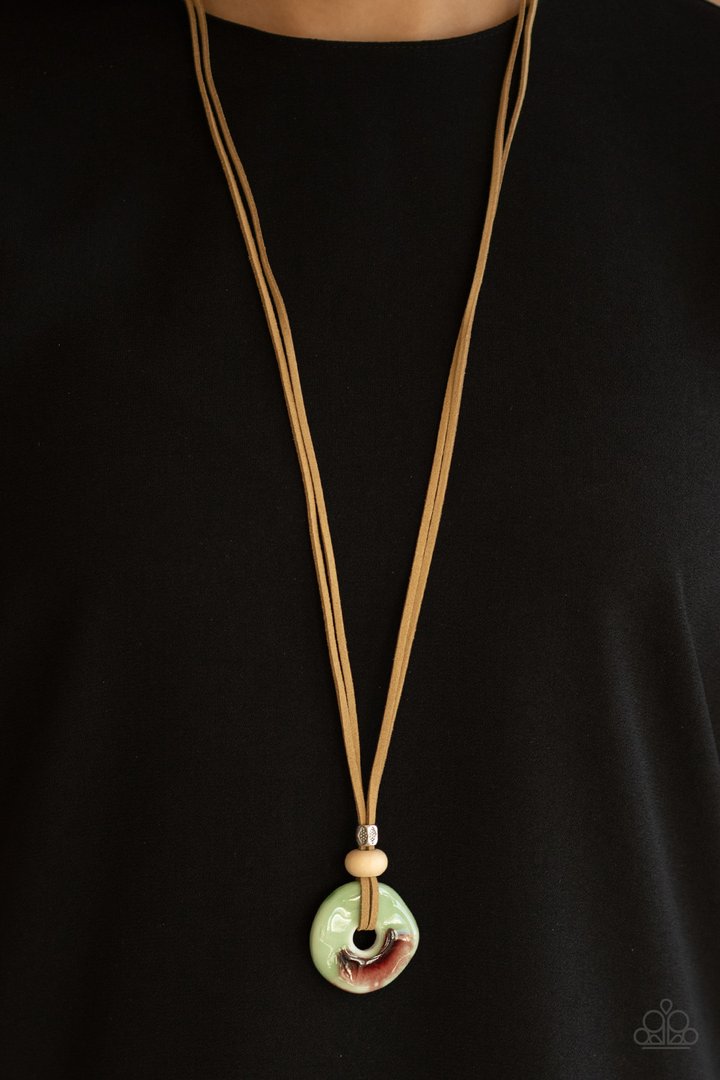 Infused with wooden and silver beads, an asymmetrical ceramic disc swings from the bottom of lengthened strands of tan suede for a colorfully earthy look. Features an adjustable clasp closure.