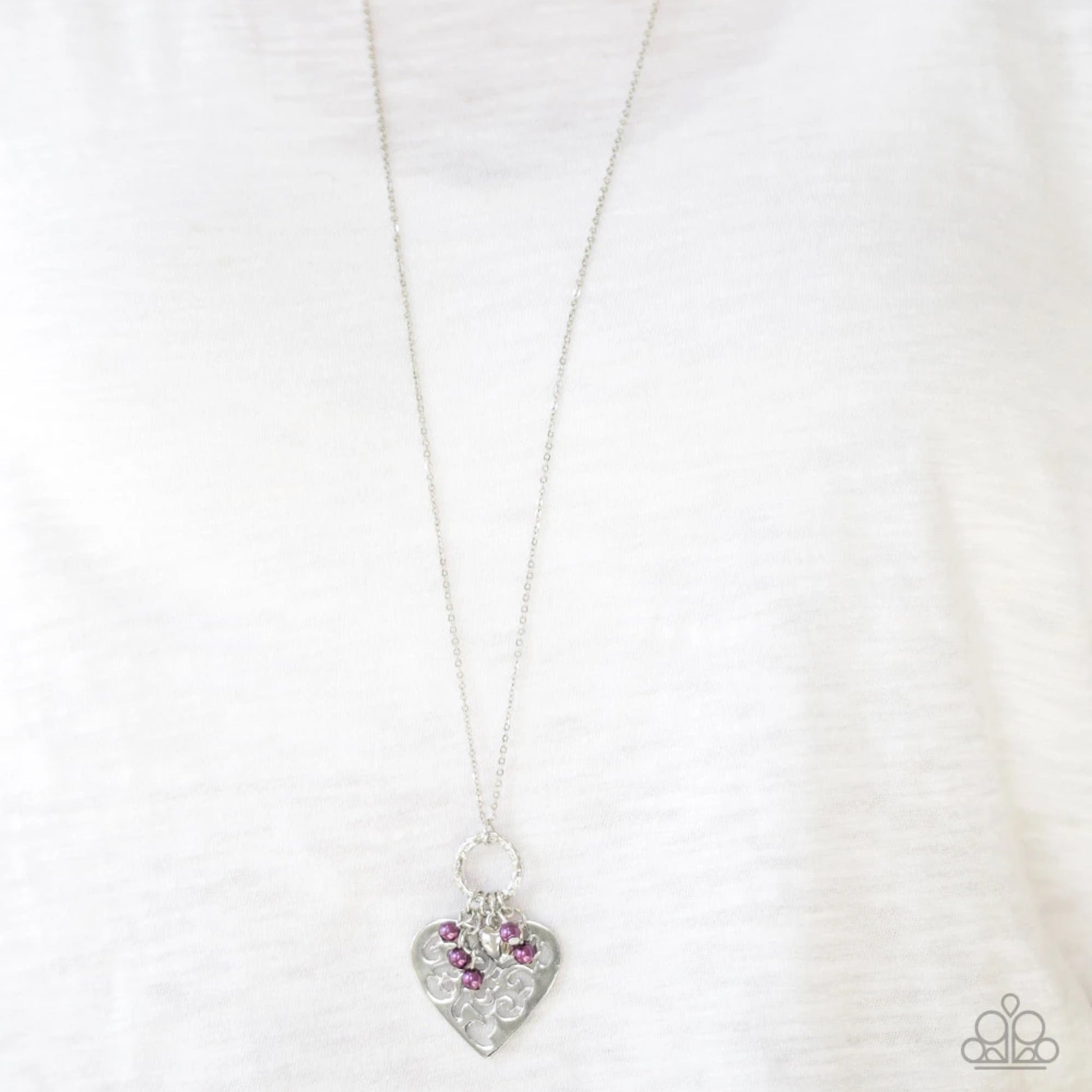 Infused with dainty purple pearls and a shimmery silver heart charm, a stenciled silver heart pendant swings from the bottom of a lengthened silver chain for a whimsical look. Features an adjustable clasp closure.
