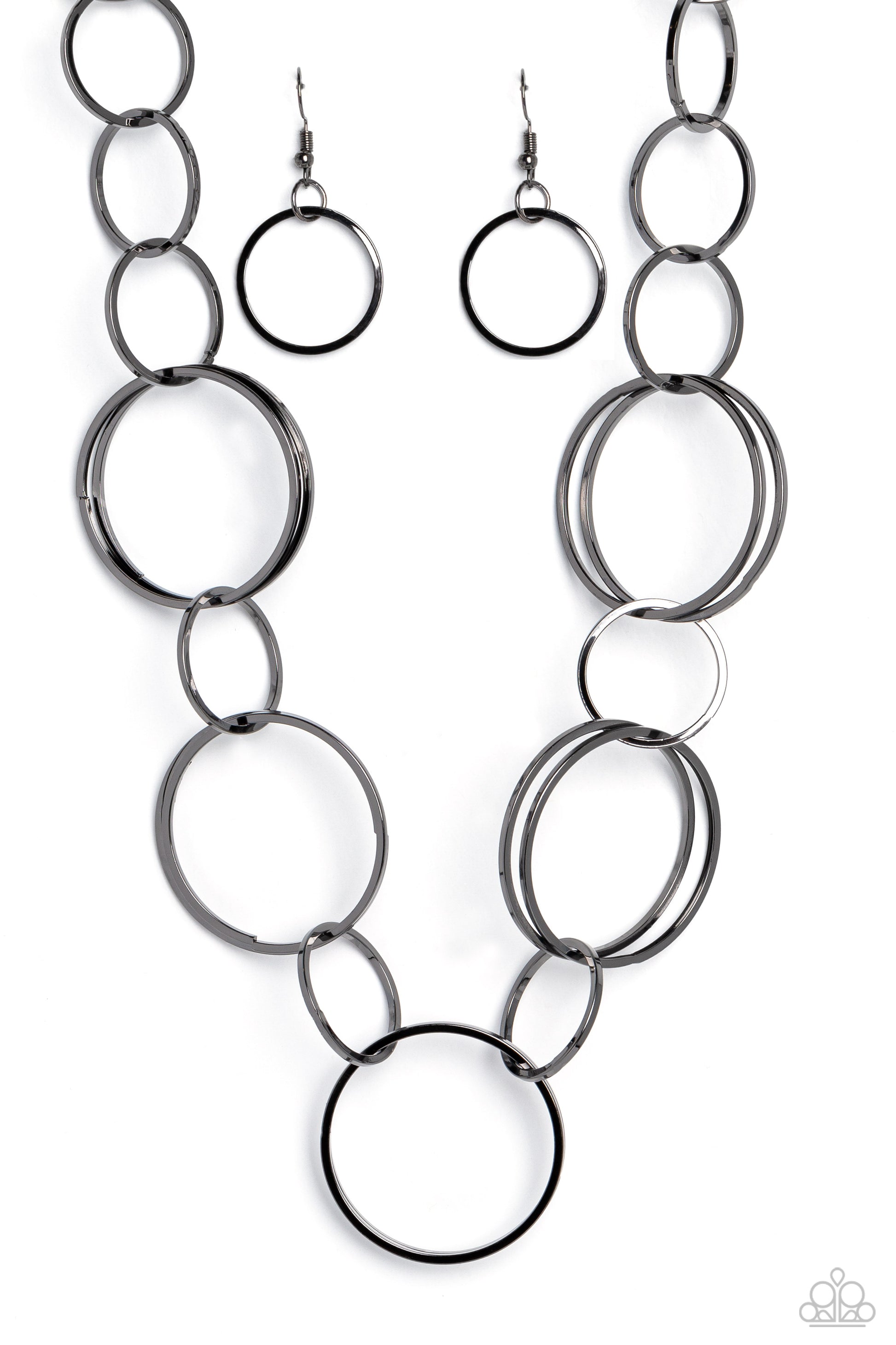 A shimmering collection of thin gunmetal hoops in varying sizes interlock and coalesce down the neckline for a refined monochromatic statement piece. Features an adjustable clasp closure.