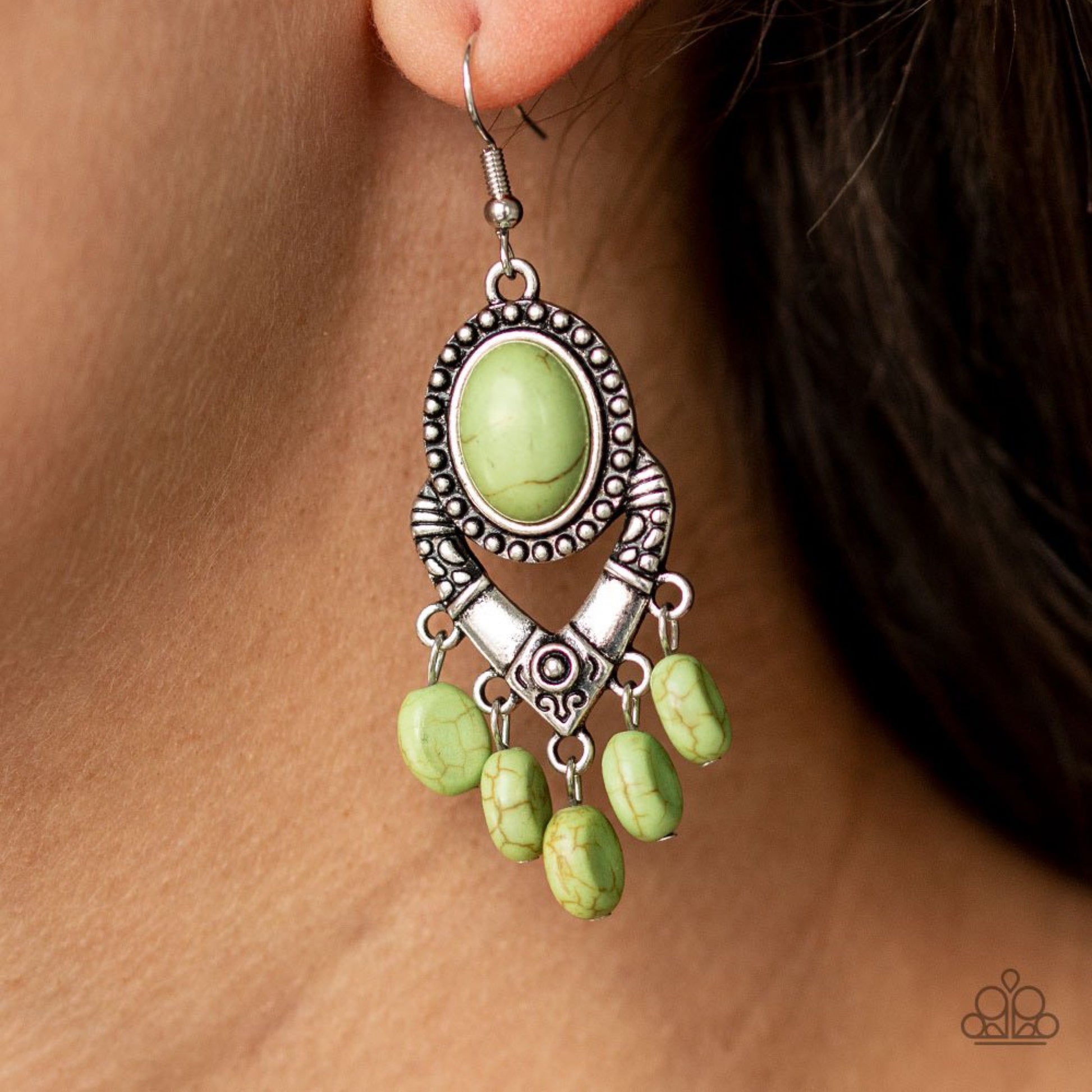 An earthy green stone is nestled inside a studded silver frame radiating with tribal inspired patterns. A matching stone fringe swings from the bottom for a seasonal finish. Earring attaches to a standard fishhook fitting. Sold as one pair of earrings.