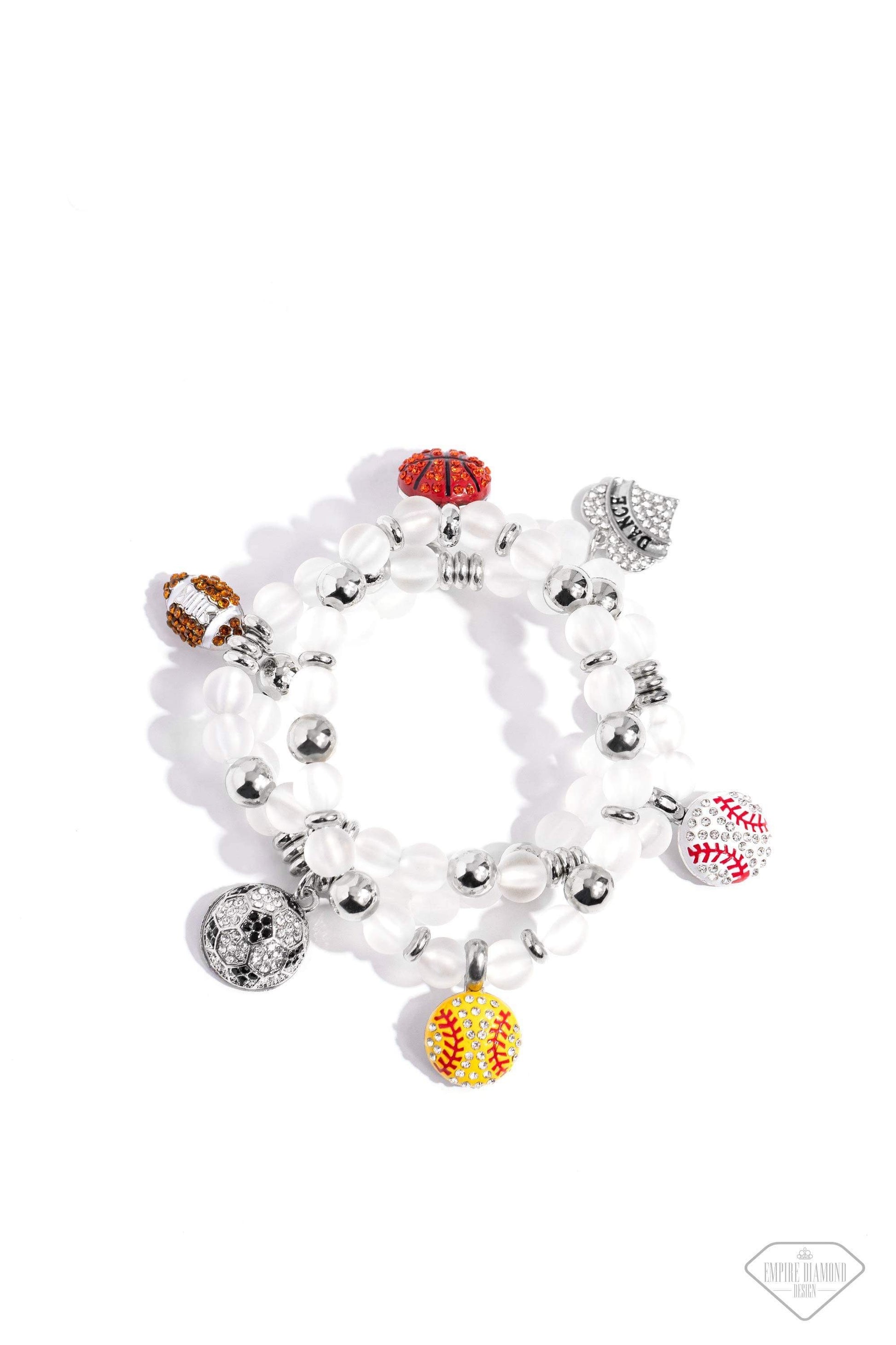 A mismatched assortment of various rhinestone-encrusted sports balls and a "DANCE"-stamped rhinestone heart, silver accents, and white glass-like beads are threaded along stretchy bands around the wrist, creating athletic-inspired layers.