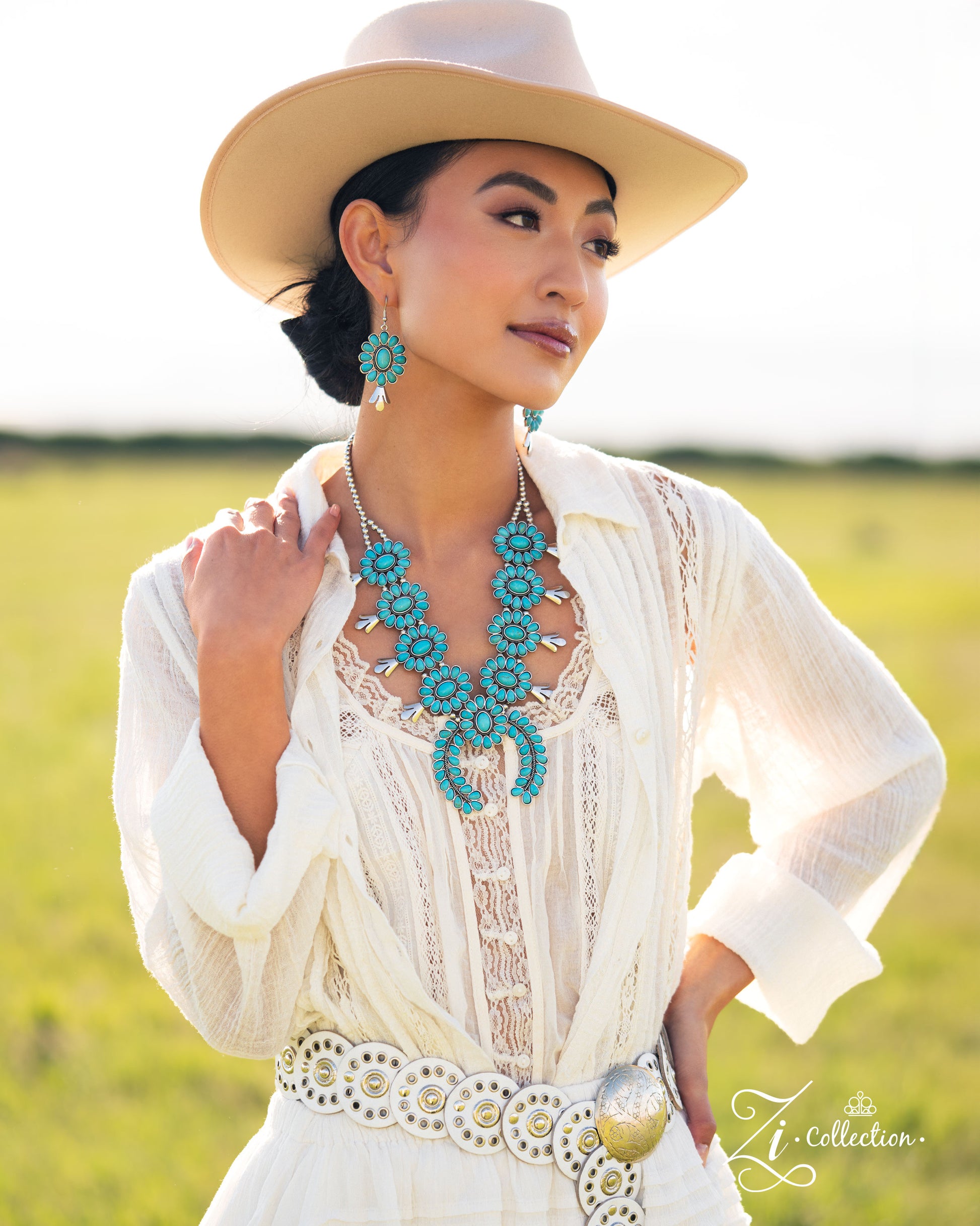 A collection of turquoise stone-embellished squash blossom frames, with an oversized crescent-shaped pendant at its center, cascades below the neckline from a strand of silver beads that split into two distinct strands. The vibrant splashes of color and antiqued rope-textured centers of the squash blossom frames infuse the rustic design with a hint of surprising whimsicality and traditional timelessness. Features an adjustable clasp closure. As the stone elements in this piece are natural, some color variation is normal.