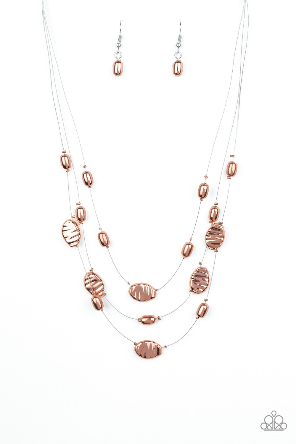 Featuring smooth and delicately hammered finishes, mismatched shiny copper beads are threaded along dainty silver wire, creating floating layers below the collar. Features an adjustable clasp closure.